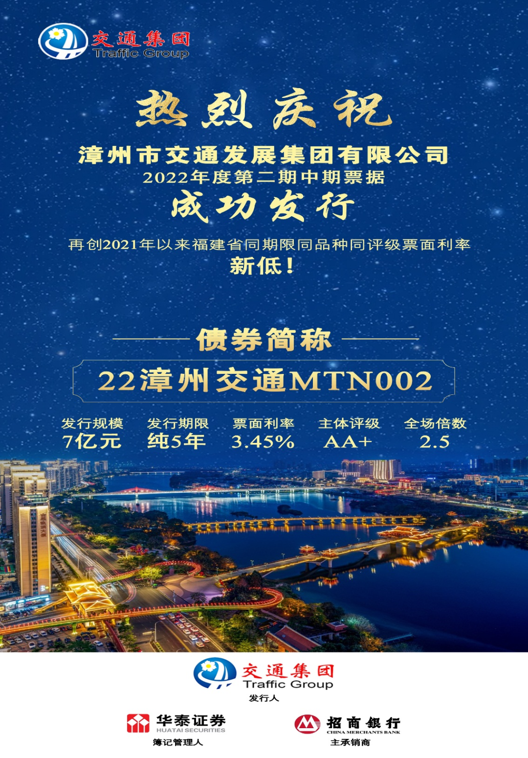 由華泰證券、招商銀行主承的漳州交通集團2022年度第二期中期票據,2022年10月20日由簿記發行,發行規模7億元,期限5年,票面利率3.45%,認購倍數2.5倍。
