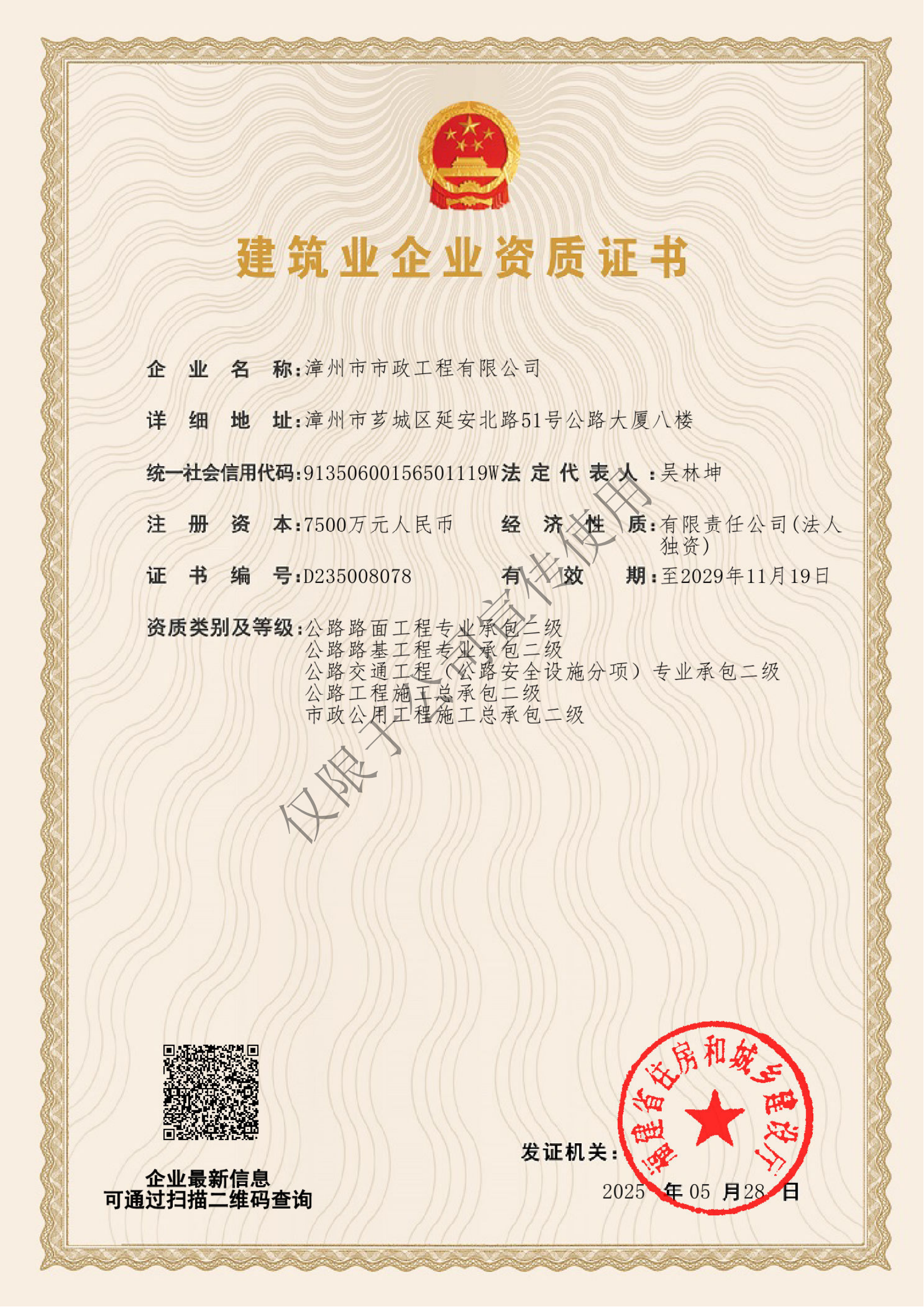 此次資質增項是漳州市市政工程有限公司發展歷程中的一個重要里程碑,不僅進一步拓寬了公司的市場準入和業務邊界,完善了公路工程服務鏈條,更有力提升了公司的核心競爭力、綜合實力和品牌影響力,為公司在市場競爭中把握機遇、實現更高質量發展提供了強有力的支撐!