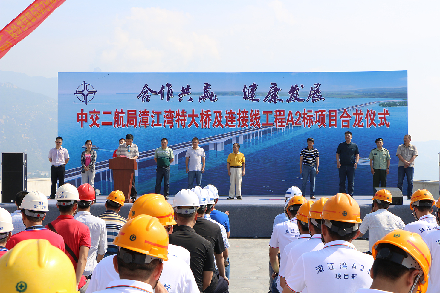 5月18日上午,隨著最后一榀T梁的成功架設,漳江灣特大橋A2標段順利合龍,云霄縣常務副縣長方偉儀,集團公司副總經理湯少青,云霄縣交通局、漳江灣特大橋建設管理部及項目部相關人員參加合龍儀式。